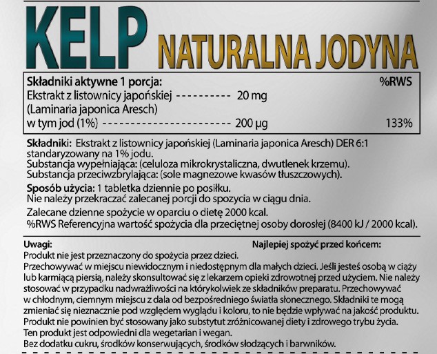 Kelp to naturalny ekstrakt z alg morskich, najczęściej z listownicy japońskiej (Laminaria japonica), bogaty przede wszystkim w jod oraz cenne minerały i mikroelementy. Jako suplement diety, kelp może wspierać prawidłowe funkcjonowanie tarczycy, pomagając w produkcji hormonów regulujących metabolizm i gospodarkę energetyczną organizmu.